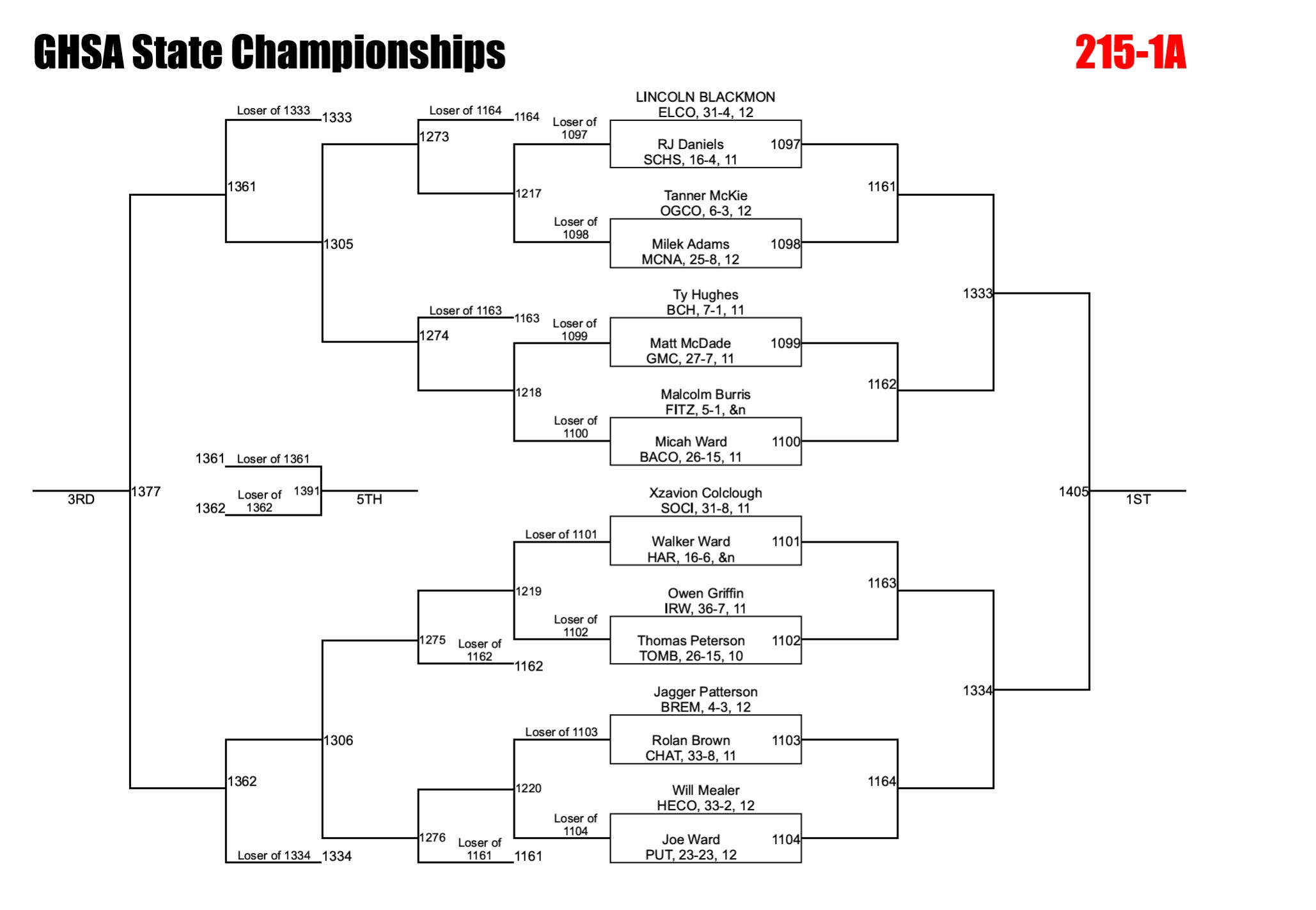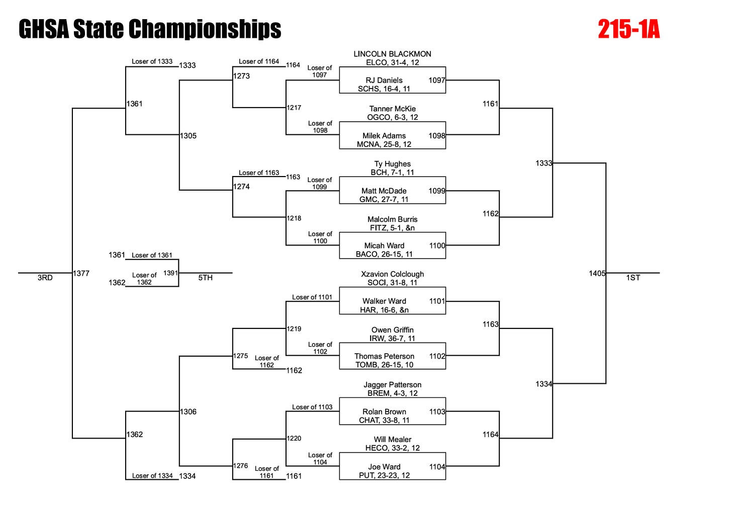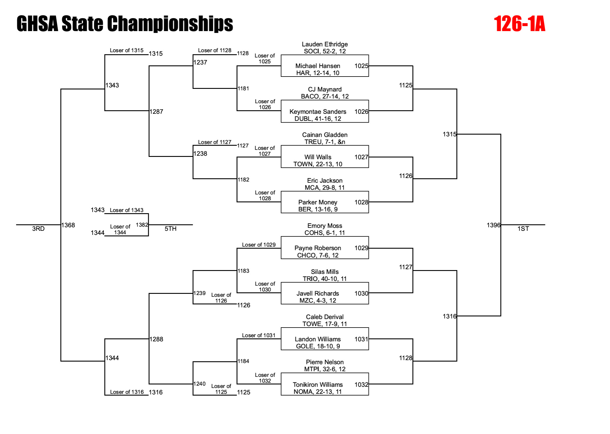 Georgia uses an alternate solution to help ensure brackets are full. If a qualified wrestler is unable to compete due to injury, the designated alternate is inserted into the bracket and the remaining competitors are adjusted accordingly. This can significantly impact both the bracket layout and individual matchups.