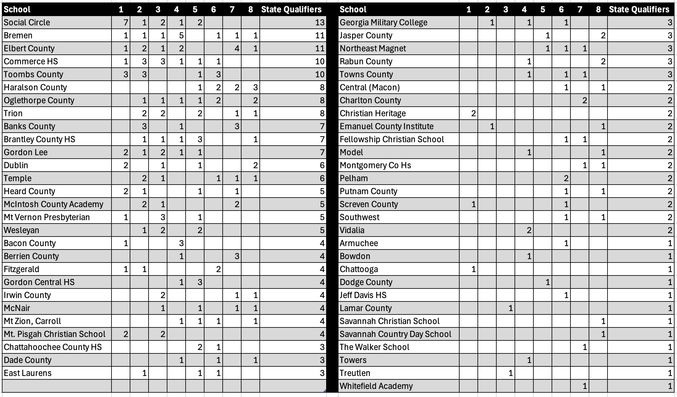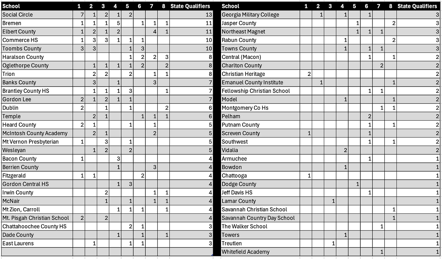 Don’t sleep on Oglethorpe County and Trion either. Both bring eight qualifiers (as does Haralson County) and have multiple wrestlers capable of making the podium—meaning big point potential. Meanwhile, Temple, Heard County, Banks County, Brantley County, Gordon Lee, and Dublin all bring enough firepower to make a legitimate push for a top-10 finish.